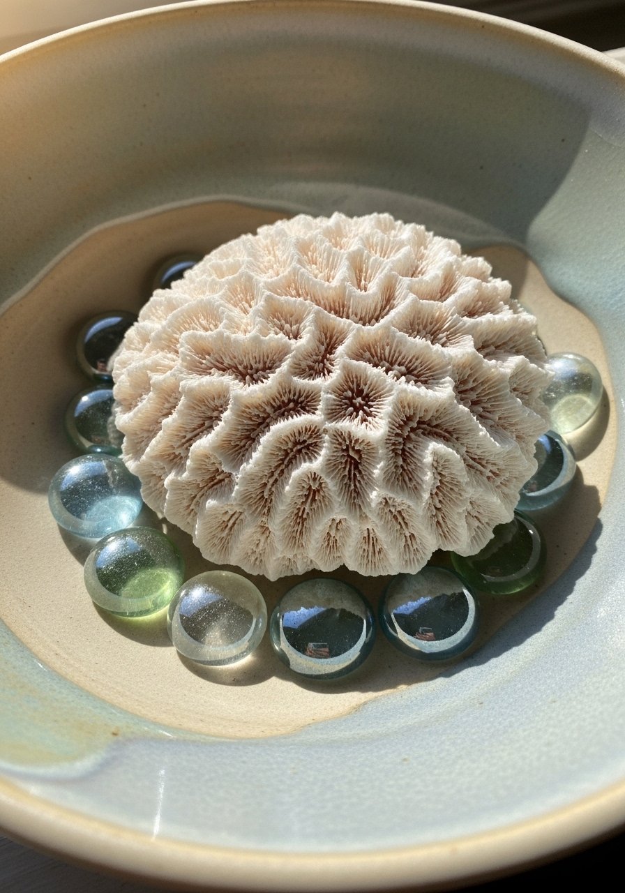 I found a small piece of wave coral and mixed it with glass beads in a shallow bowl. It’s a subtle coastal detail that never screams theme. The combo adds texture and conversation without feeling literal.