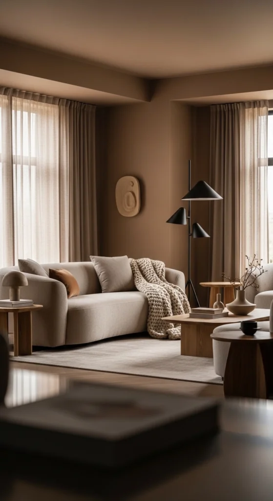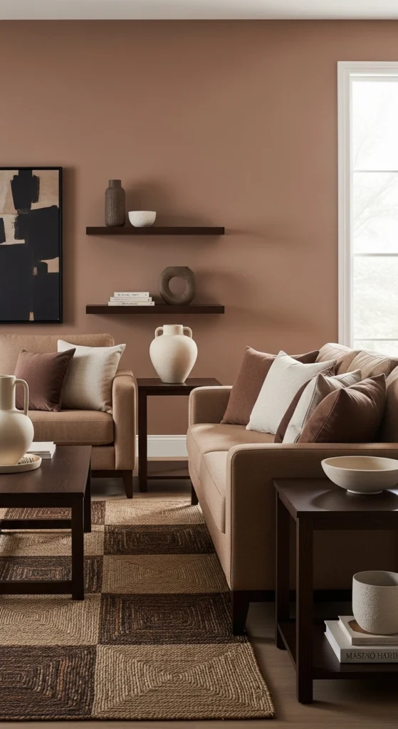 Brown shades bring warmth without feeling heavy. Start small. Paint one wall in a cocoa or chestnut tone. Keep the rest light. Pair it with cream cushions and pale wood furniture. If paint feels like too much, use brown through pillows, throws, or a rug. Thrift stores often have neutral textiles that fit right in. For DIY art, frame fabric swatches in chocolate and caramel tones. Kitchens also welcome brown through wood cutting boards or ceramic bowls. These shades feel calm and grounding while staying easy to live with.