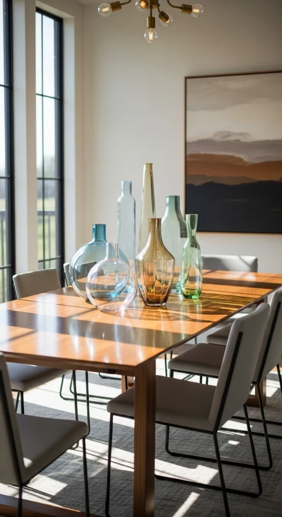 Glass adds shine and softness. Look for colored vases or bowls. Thrift stores often carry them. Place near windows to catch light. One or two pieces are enough.