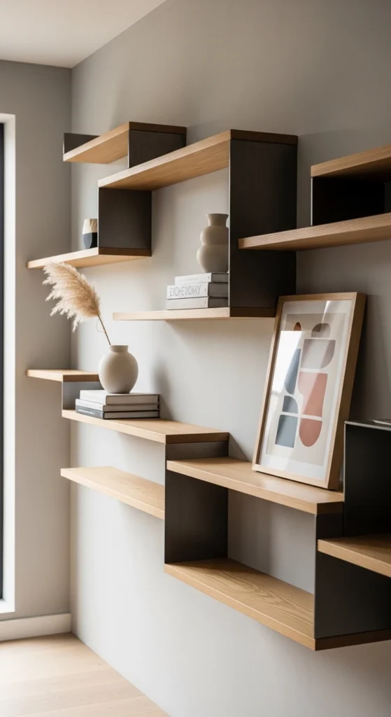 Shelves don’t need to match perfectly. Mix brackets and boards. Paint them the wall color. This adds interest and storage without custom costs.
