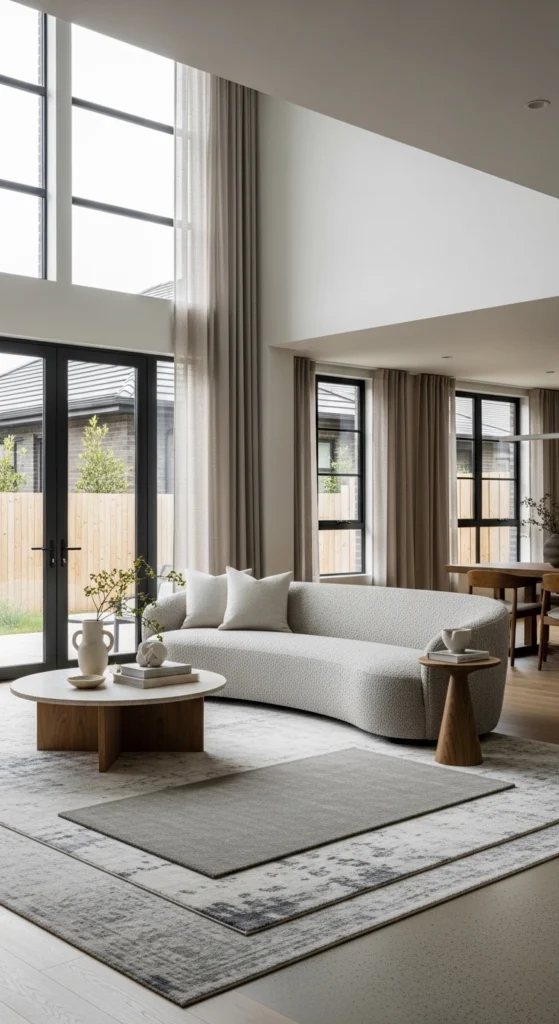 Curved seating changes how a room feels. It invites conversation and softens sharp corners. If a new sofa isn’t an option, try curved elements nearby. A rounded chair, oval table, or arched mirror helps. DIY option: rearrange furniture into gentle arcs instead of straight lines. Even small changes make open spaces feel more welcoming.