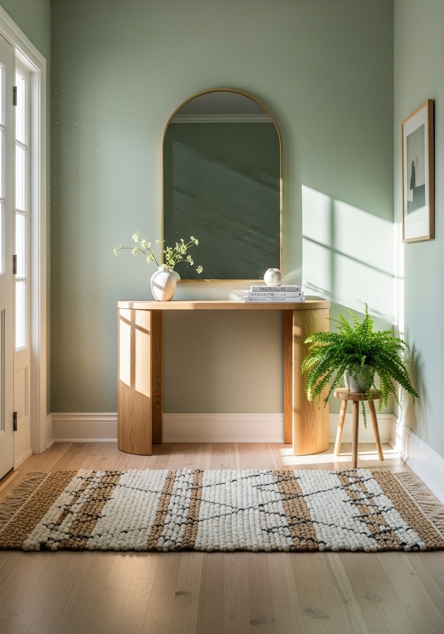 Swapping a rectangular mirror for an arched one made my entry stop feeling so sharp. Curves lower visual tension and invite you in. I added a round coffee table and the seating area immediately felt more intimate.