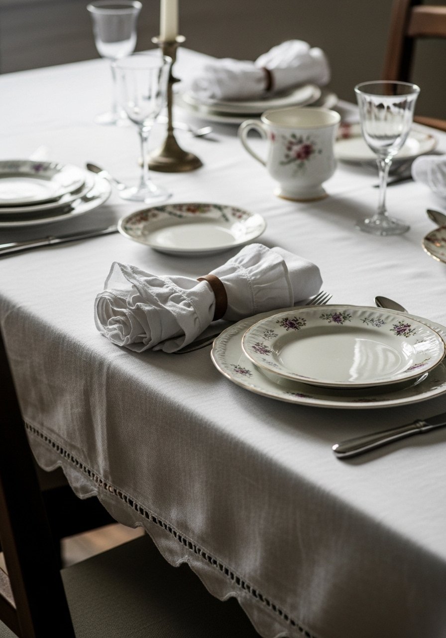 I have a small set of scalloped napkins that instantly make dinners feel slower and gentler. Ruffles and scallops add romance without being overdone. They read like something your grandmother would have kept and used.