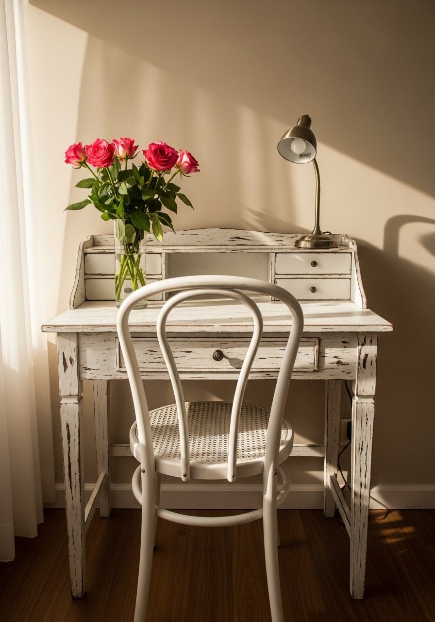 I set up a tiny desk under a window and added a white cane chair. It became my slow corner—letters, tea, and no laptop at night. Distressed paint reads like life lived, not showroom-new.