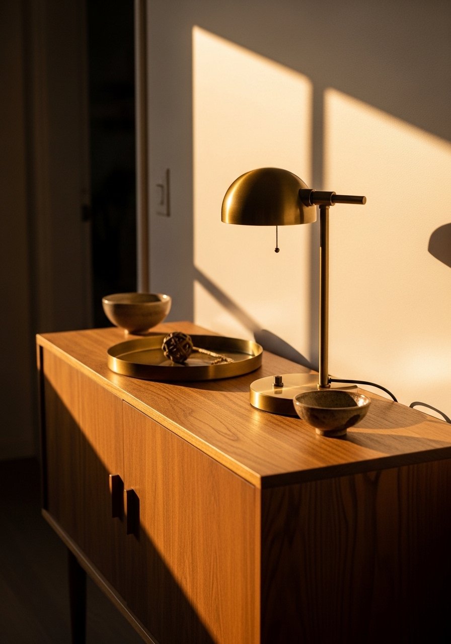 My mistake was adding too many shiny items; it read fussy. Pick one brass lamp and one small brass tray. Patina is fine—don’t polish everything to a shine.