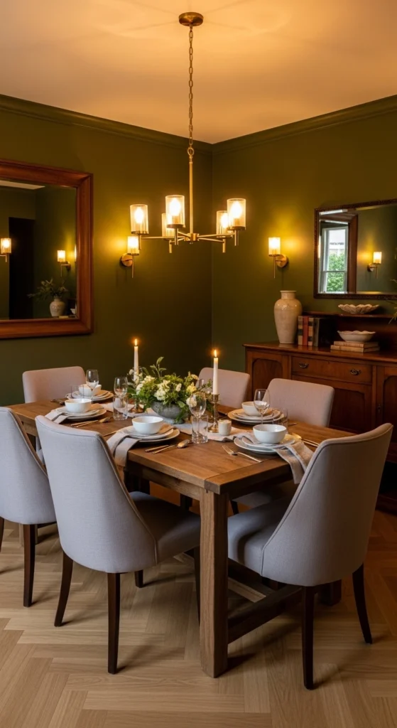 Dark walls bring instant character. Olive, navy, or charcoal wraps the room and makes gatherings feel relaxed. Paint is one of the lowest-cost changes you can make. Try one accent wall if a full room feels bold. Pair darker walls with light wood furniture to keep balance. Add simple frames or mirrors to break up large areas of color. Matte finishes hide wall flaws better than gloss. Even rental-friendly peel-and-stick paint options now exist. The result feels cozy and intentional without buying new furniture.