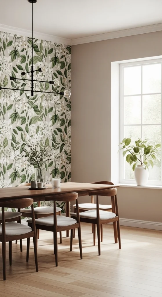 Wallpaper adds personality fast. Use it on one wall to control cost. Peel-and-stick styles are renter-friendly. Botanical patterns feel calm and social. Keep furniture simple so walls shine.