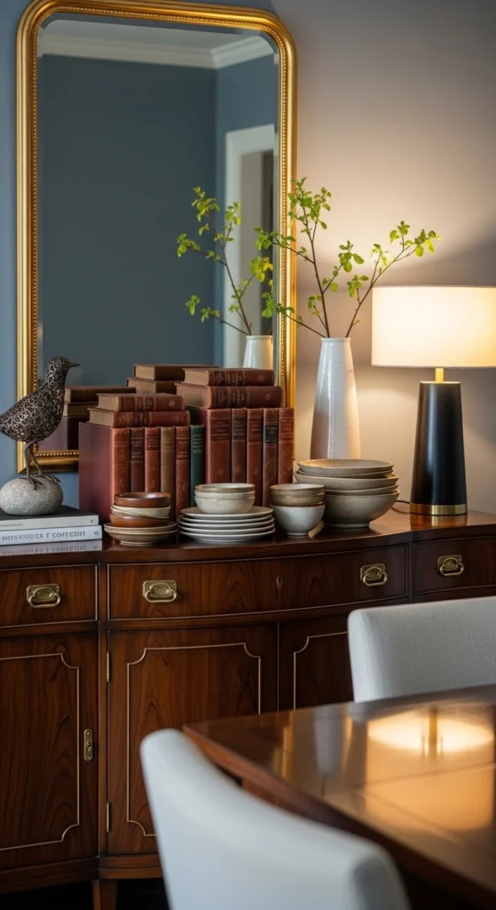 Sideboards hold serving items and decor. Vintage ones are affordable secondhand. Style the top with stacked plates, a lamp, and art. This adds function without crowding the table.
