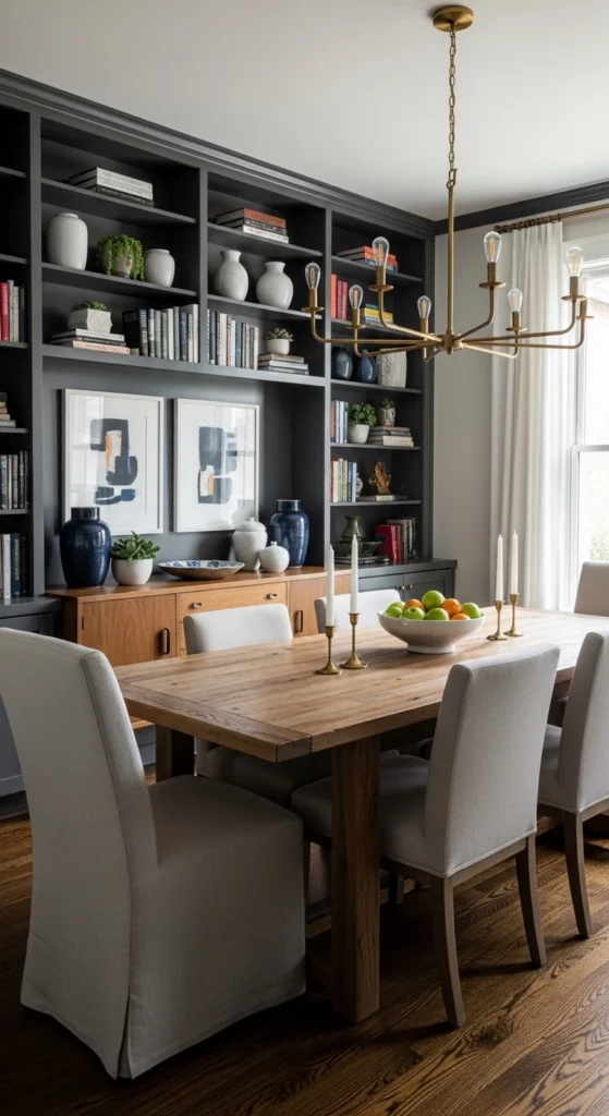 Books add warmth. A shelf wall turns dining into a lived-in space. Use inexpensive shelving units and paint them one color. Style with books and simple objects. Guests feel at ease in rooms that show real life.