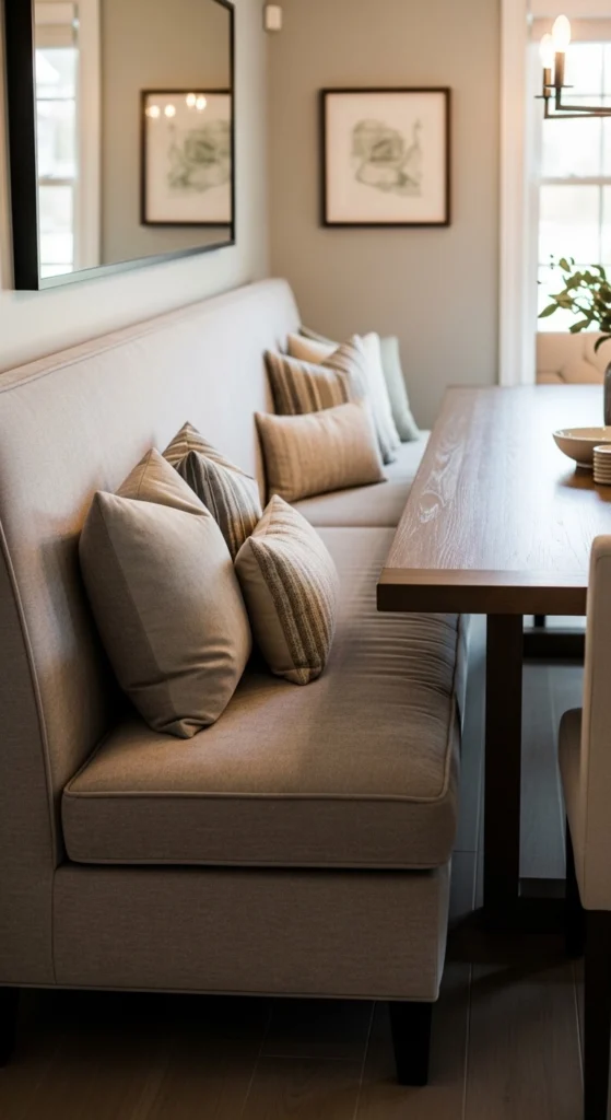 Banquettes save space and feel inviting. You can DIY one using a bench, wall brackets, and cushions. Add storage bins underneath for linens. This setup works well in apartments or open layouts. Guests love sinking into padded seating. It feels relaxed and practical at the same time.