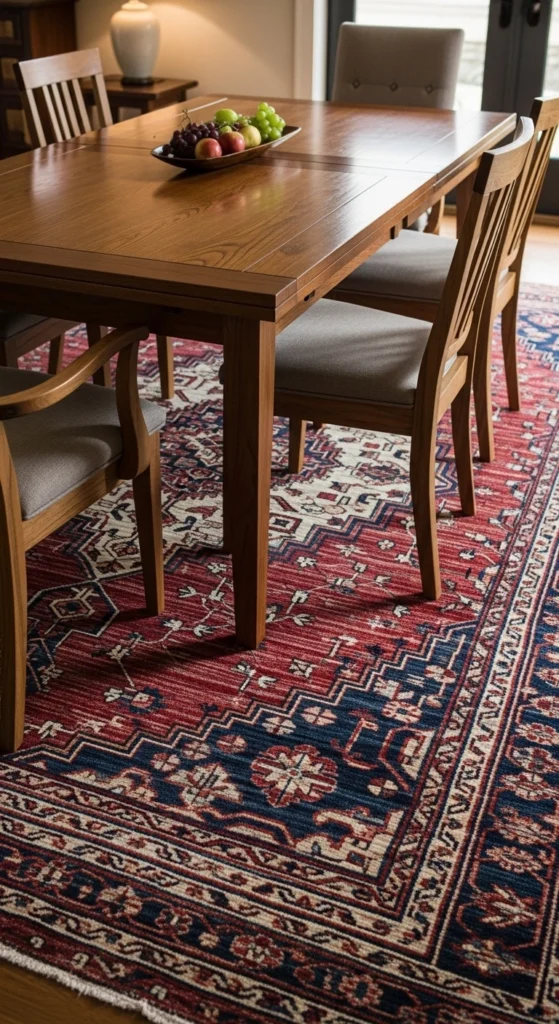 Rugs define the dining zone. Choose one large enough for chairs to slide easily. Flat weaves clean easily and cost less. Layering a smaller textured rug on top adds interest. This also helps with sound in echo-prone rooms.