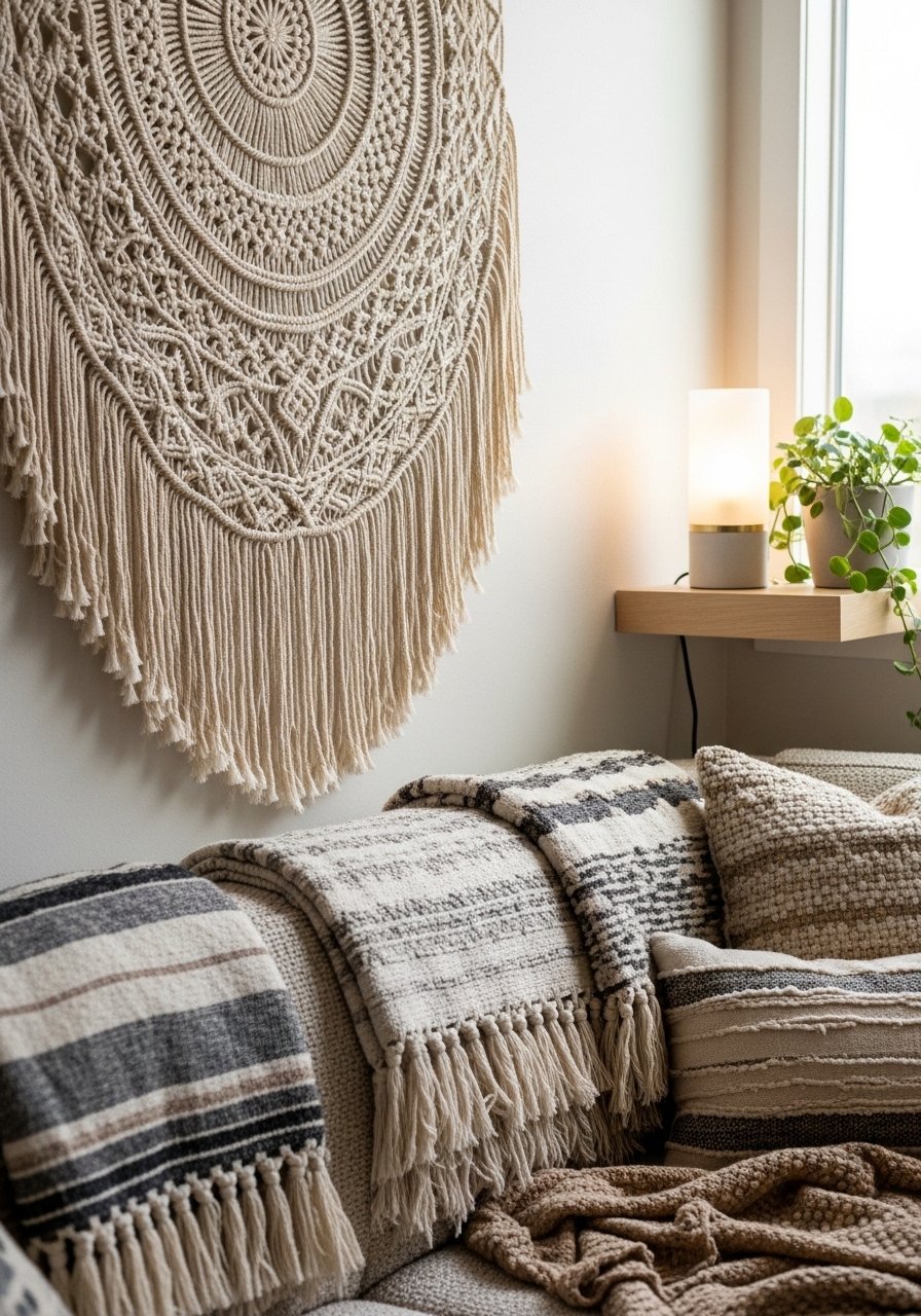 I added a woven wall hanging and a cream chunky knit throw to a small corner and it stopped feeling like a hallway. Layered textures — macramé, wool, linen — make the wall feel intentional. I used this cream chunky knit throw and a framed macramé piece. The mistake to avoid is overstuffing: one statement textile plus one accent works better than multiple competing patterns. This creates a warm, tactile corner that begs you to sit.