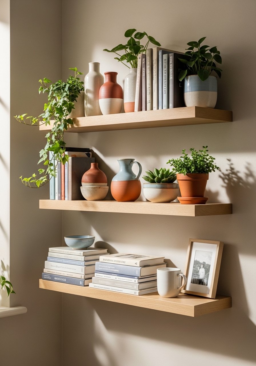I installed a set of three white oak floating shelves and styled them with odd-numbered objects and varying heights to avoid a crowded look. A 2:1 ratio of decorative objects to plants keeps things fresh. These white oak floating shelves look clean and modern. Avoid lining everything up — stagger heights and leave breathing room. The shelves add depth, a place for personal items, and an easy way to rotate seasonal decor.
