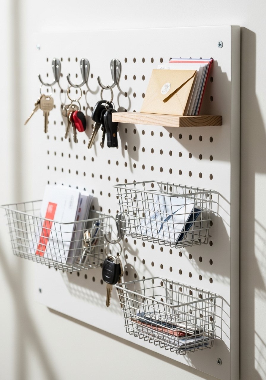 I painted a pegboard to match my trim and used it to hang baskets, hats, and a small mirror. It’s functional and looks styled when you keep the color palette limited. I used brass hooks and a small floating shelf for keys. A common mistake is filling every hole — leave negative space so it reads intentional. Pegboards are perfect for renters who need flexibility and for small entryways that need a tidy landing zone.