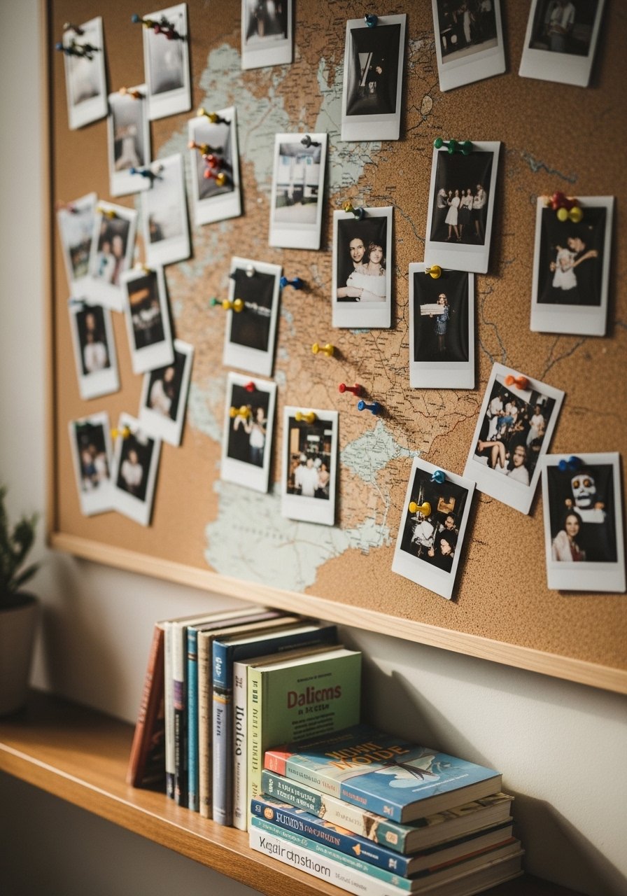 I created a cork map wall to display ticket stubs and photos, making a blank wall deeply personal. Use a large cork sheet and frame it for a finished look. I kept color accents consistent across pins for cohesion. Add cork map board sheets and brass push pins. Avoid random placement of photos — anchor with a grid or diagonal line to keep it readable. It becomes a conversation starter and memory wall.
