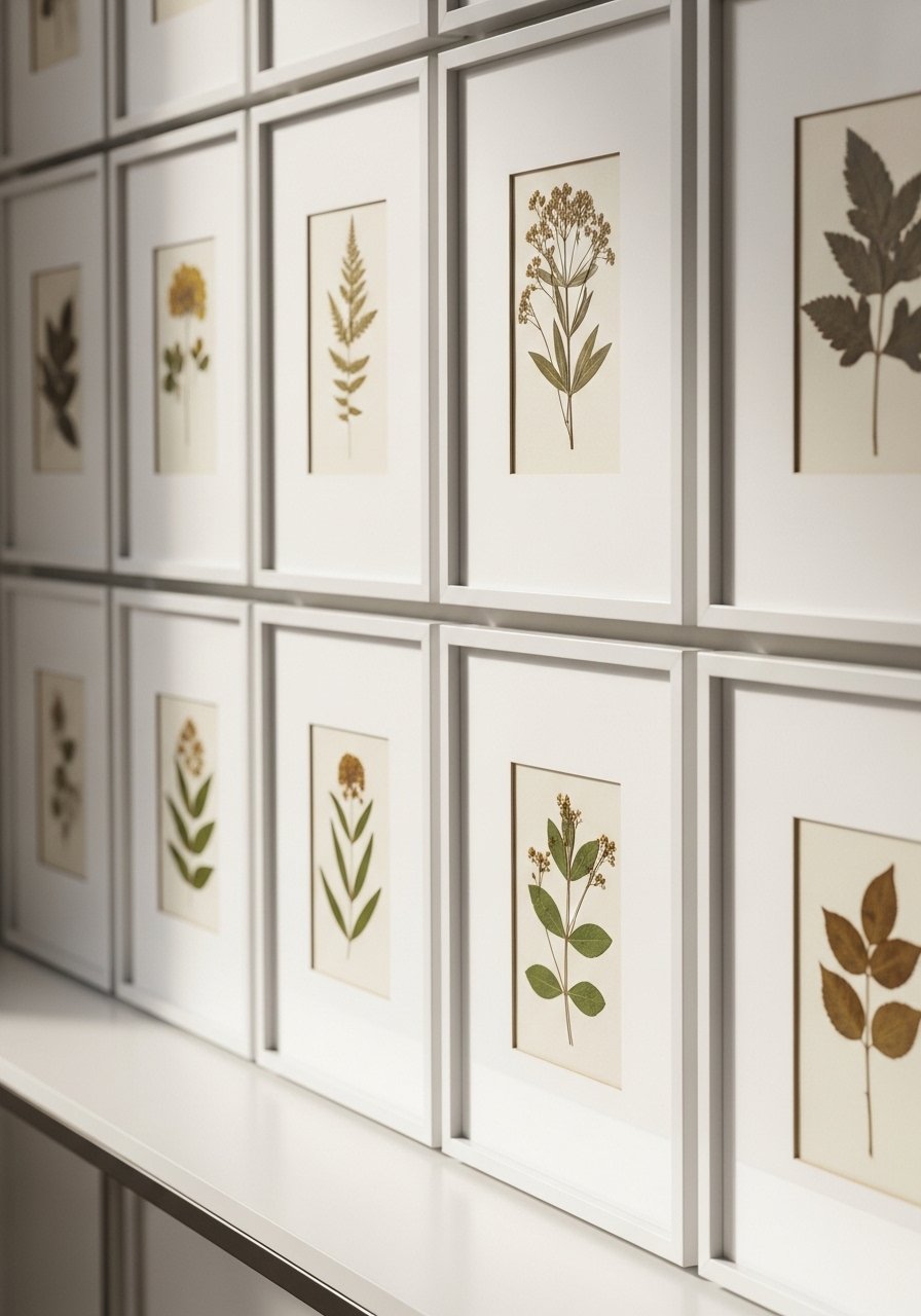 I pressed leaves and framed them in white mats for a calm, gallery-like arrangement that feels both modern and organic. Consistent matting keeps the display cohesive even with varied specimens. I used thrift frames refreshed with paint and added new white picture mats. Avoid mixing too many colors in frames — stick to one or two finishes. The result is understated, refined, and perfect for small baths or bedrooms where simplicity matters.