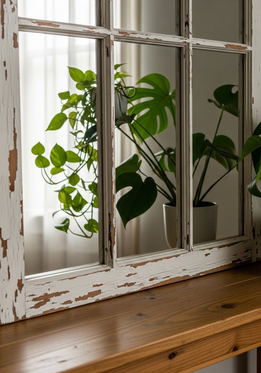 I found an old window, added mirror panels, and rehung it as wall art — it feels like a window into another room. The aged paint adds character. If you don’t want to DIY, choose a window-style mirror. I paired mine with a small fiddle leaf fig nearby. Avoid mismatched scale: the window should be at least half the width of the console below. It gives a room vintage personality without feeling kitschy.