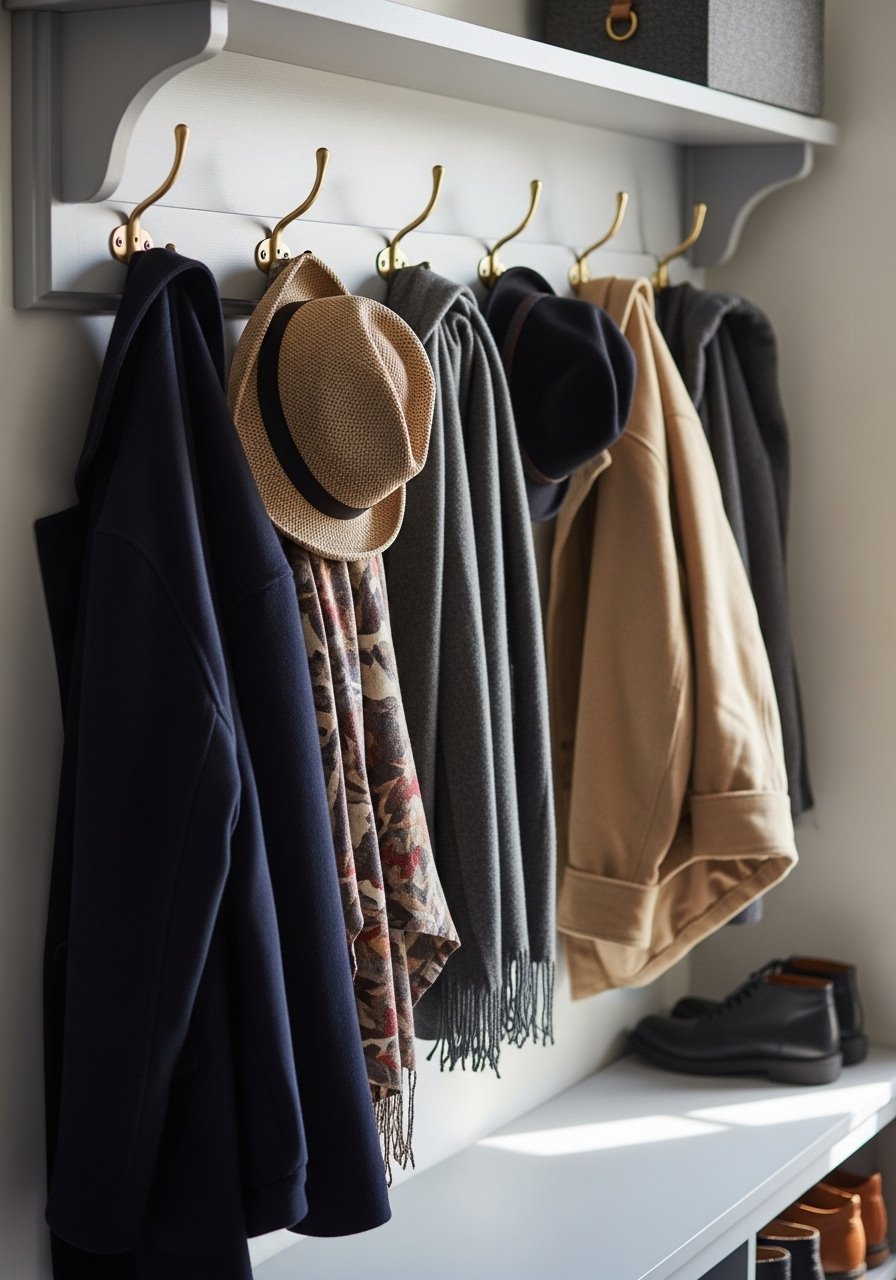 I installed a slim peg rail with brass hooks at entry height and used it to display framed prints and everyday outerwear. It keeps things tidy and doubles as a display area. Use consistent hook finishes for a unified look. I paired it with brass hooks and a small shelf above. Mistake to avoid: placing hooks too high — aim for comfort and accessibility. This solution is ideal for busy households and small foyers.