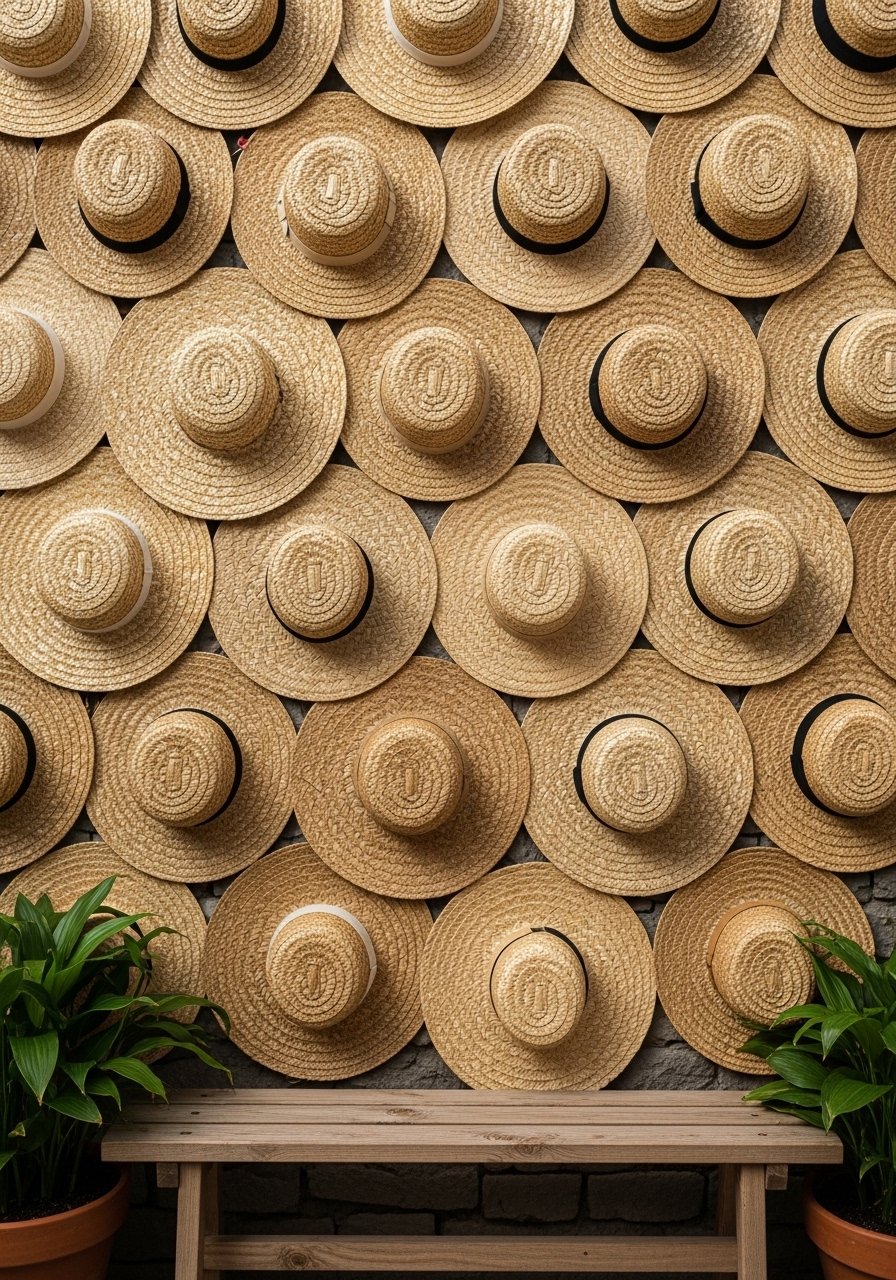I arranged woven hats on a wall to add instant texture and personality to the entry. Group them by material and tone for cohesion. Straw, raffia, and leather look great together when placed in an odd number cluster. Avoid mixing logos or sports caps with artisan hats; it dilutes the aesthetic. This idea is affordable and adds a collected, sunlit feel, especially when paired with a small coat rack or a lean mirror nearby.
