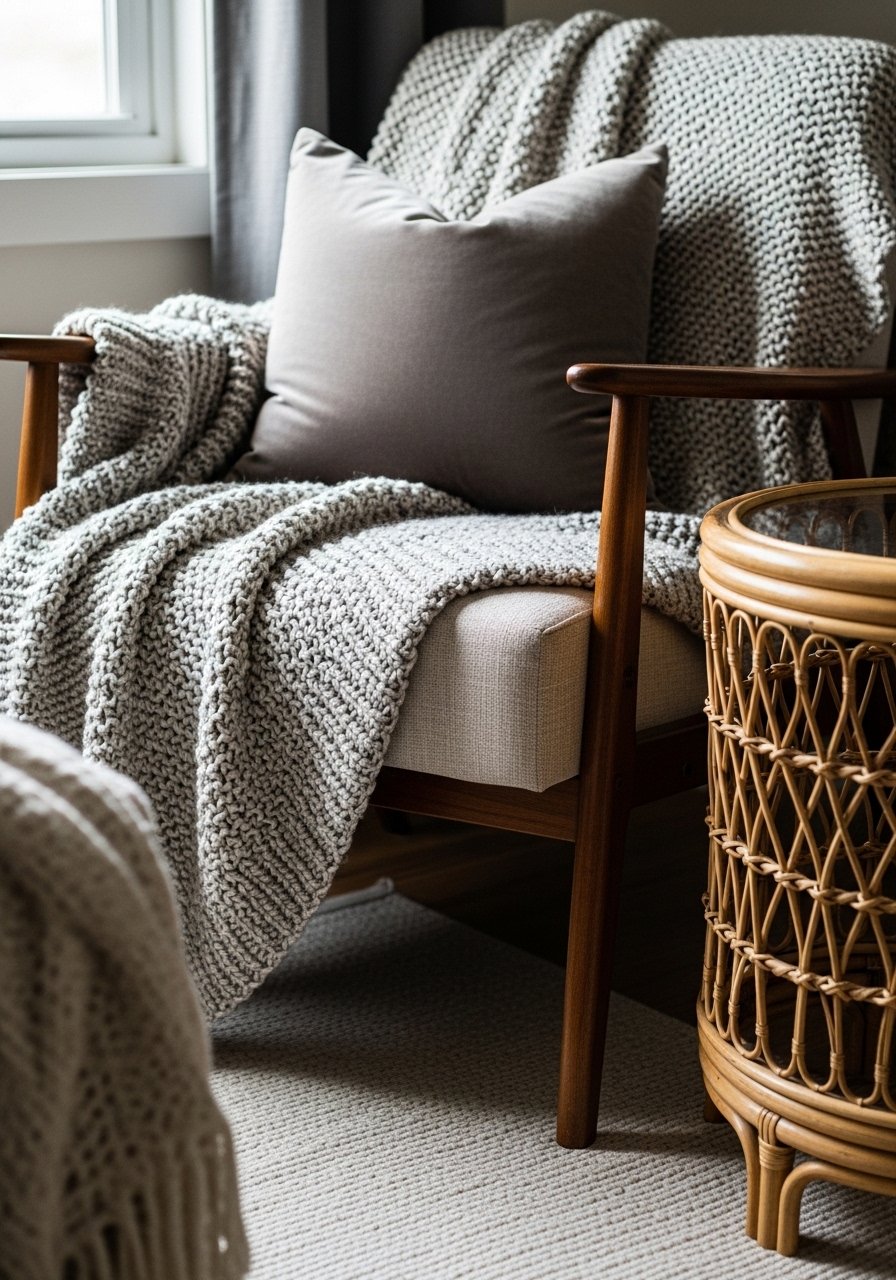 I layered a cream chunky knit throw and a velvet pillow to make a corner instantly feel curated. The mix of linen curtains and a small woven rug keeps the look relaxed. Use odd numbers — three pillows or one pillow plus a throw — for balance. Avoid overstuffing the chair; too many cushions look staged. This creates a cozy, collected reading spot without feeling like a retail display.