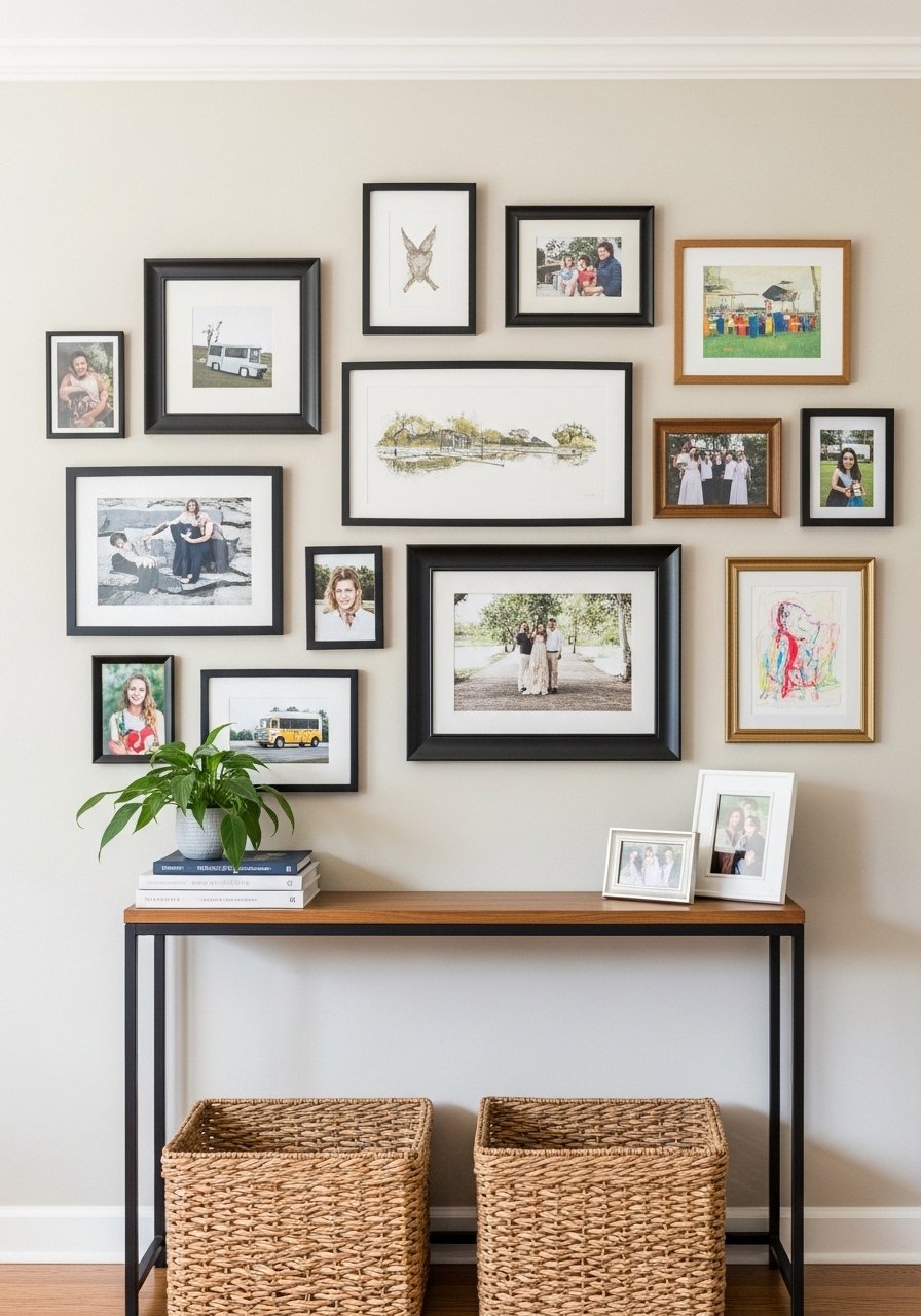 I mixed thrifted gilt frames with simple black ones to build a gallery that reads collected instead of themed. I used a cluster centered above my console; keep spacing around 2–3 inches. Swap in white picture mats to give mismatched art a cohesive field. Don’t over-plan the layout on the wall—lay frames on the floor first. The result feels personal and layered, a signature of eclectic home decor.