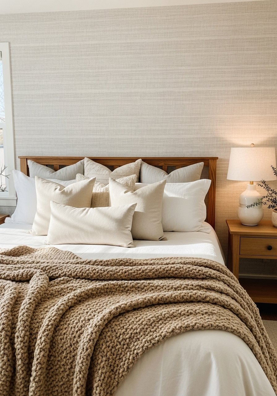 I used neutral peel and stick wallpaper panels behind my bed to add depth without commitment. The linen texture reads natural and adds subtle pattern. Keep surrounding decor simple—one bold headboard or layered pillows to balance. Avoid applying wallpaper in tiny strips that interrupt the pattern; full-panel placement looks more intentional. This is an easy way to add an artistic focal point without painting or a major renovation.