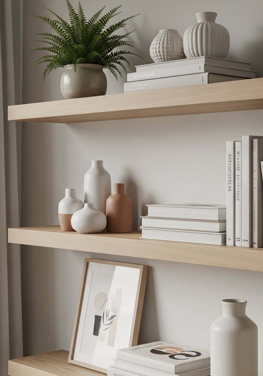 I styled floating shelves with a trio of vases, a stack of books, and a small plant to get that editorial, collected vibe. I used white oak floating shelves to anchor the display. Use odd numbers, vary object heights, and layer small art in front of taller items. Avoid filling shelves edge-to-edge; leave breathing room. The result feels curated, like a found object vignette from a favorite store.