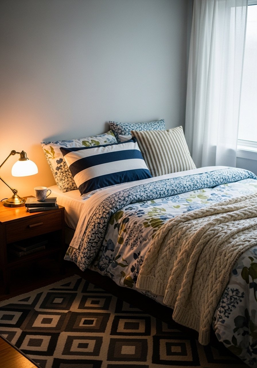 I mixed a floral duvet with striped pillows and a geometric rug for an eclectic bedroom that still feels cohesive. Limit the palette to two or three recurring colors to tie patterns together. I kept the walls neutral and added texture with linen curtains. Avoid clashing scale—pair a small-scale print with a larger one for harmony. Pattern mixing makes a bedroom feel collected and personal rather than chaotic.