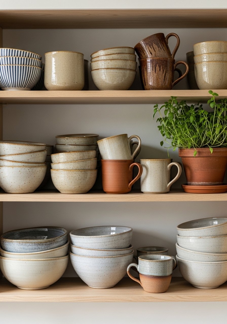 I grouped ceramic bowls and earthenware mugs on open shelves to make the kitchen feel curated. Stick to a tonal family like creams and warm terracotta for a collected look. Use an odd number of pieces and vary heights for interest. Avoid overcrowding shelves—leave negative space to let each object breathe. This simple change makes everyday dishes read like decorative objects.
