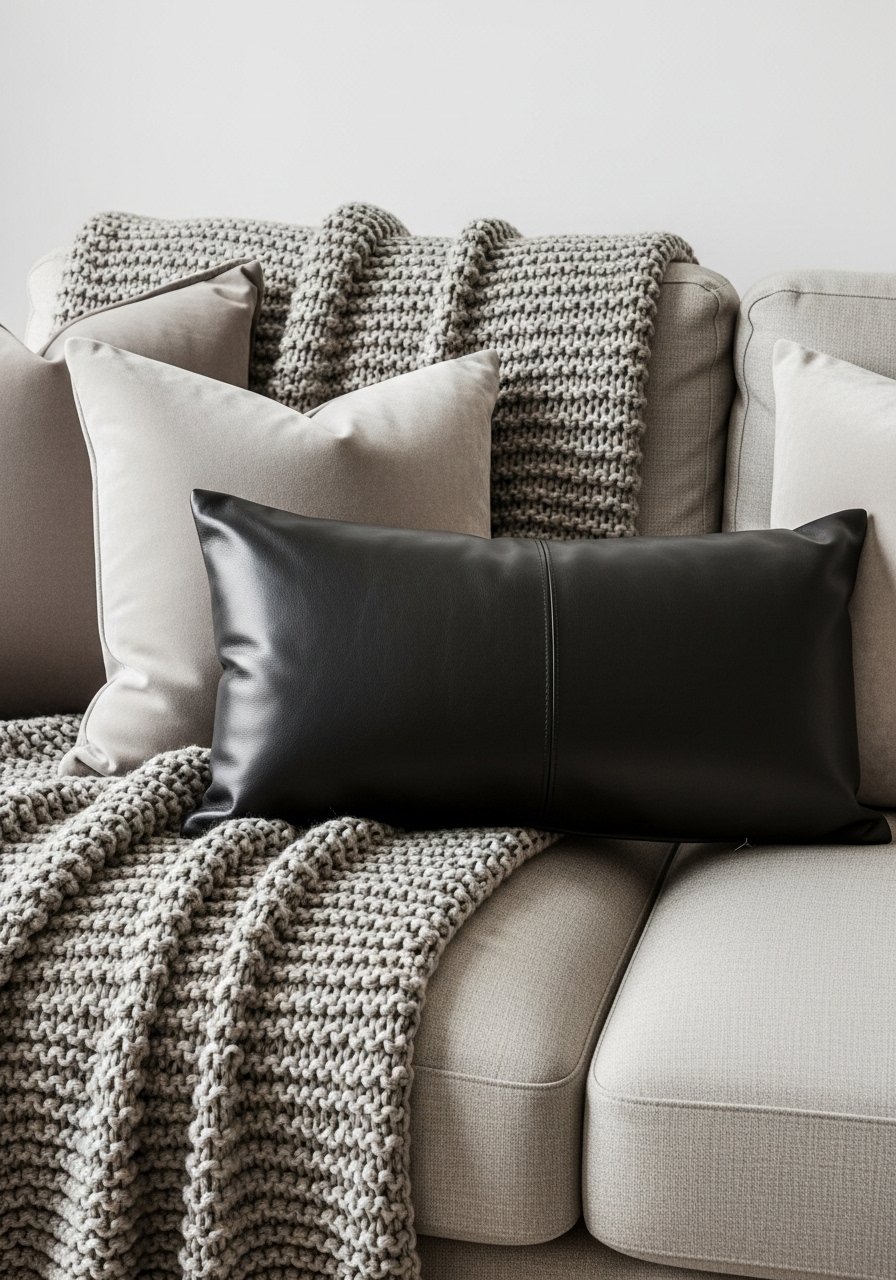 I paired a leather lumbar pillow with velvet and a chunky knit to make my neutral sofa feel layered and interesting. Stick to a restrained palette and mix textures—linen, leather, velvet, knit—to keep unity. I used velvet pillow covers for depth. Avoid using the same texture across all pillows; variety reads collected. This approach makes a simple sofa look intentional and lived-in.