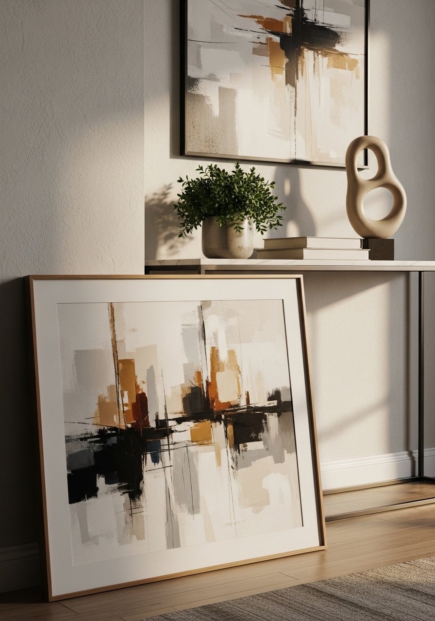 I leaned an oversized abstract piece on the floor behind my console for a relaxed gallery feel. The scale creates impact without committing to holes in the wall. Pair with a plant and a small stack of design books to anchor the composition. Avoid tiny artworks in oversized frames; scale matters. Leaning art feels casual, collected, and a little bohemian — perfect when you want art that feels lived-in.