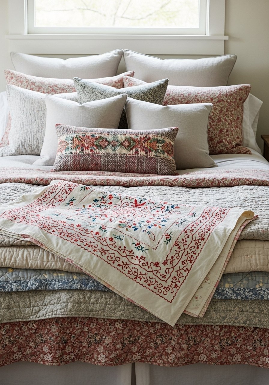 Mix of Heirloom and New Bedding for Depth