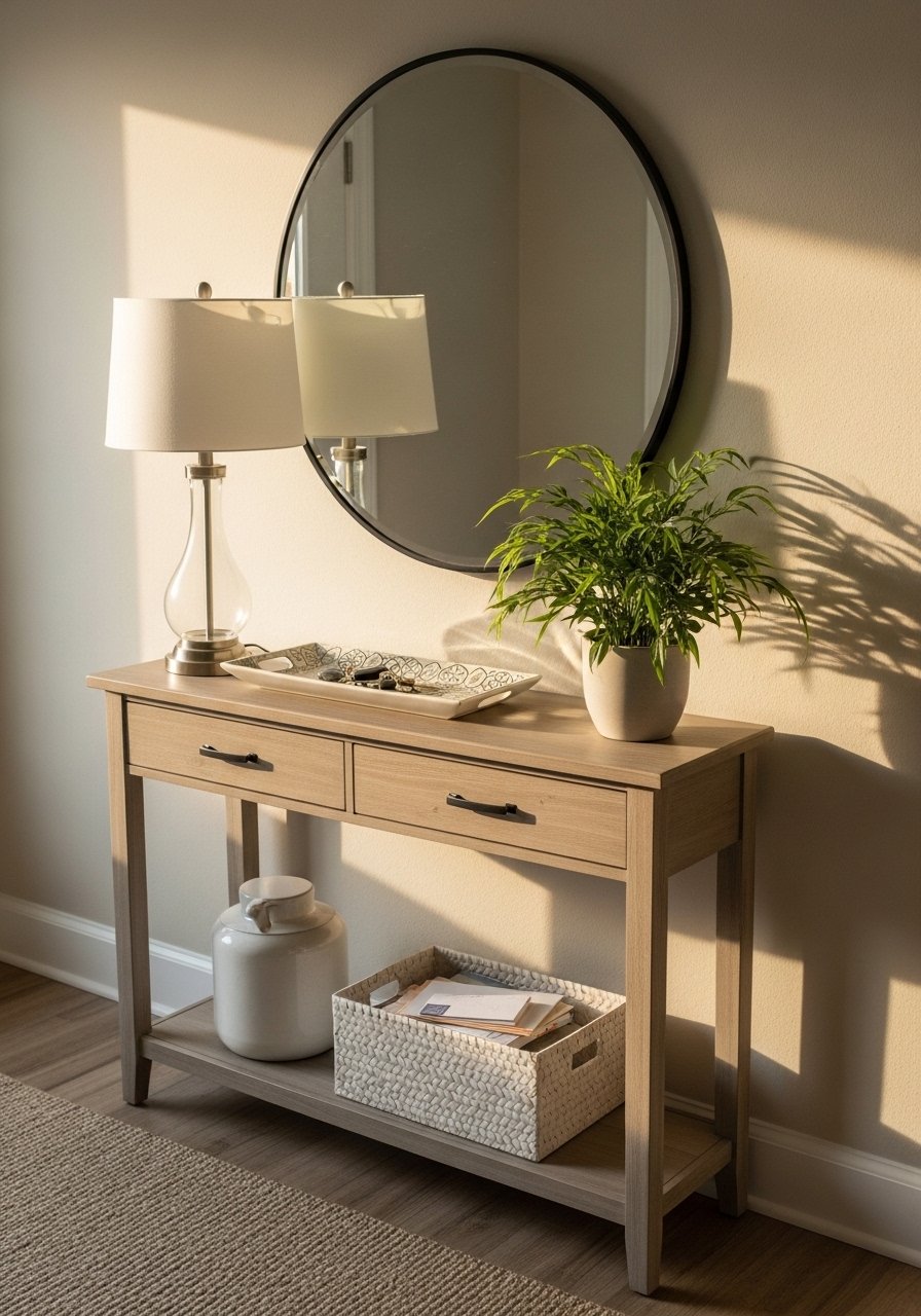I styled my console with a shallow ceramic tray for keys, a small lamp, and a mirror above to catch light. Using a tray organizes the look while still feeling casual. I used a medium brass mirror to add warmth. Avoid crowding the console; one lamp, one tray, one plant is plenty. This setup feels collected and purposeful — practical styling that still reads like decor.