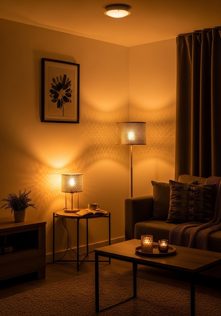 I built three light layers: overhead, task, and accent. Dimmable overhead light, a floor lamp by seating, and a table lamp on a console let me control mood. I swapped bulbs for warm tones to keep things inviting. Avoid relying on a single harsh ceiling light. Layered lighting makes the space feel both functional and cozy, and it highlights the eclectic mix of objects and textures.