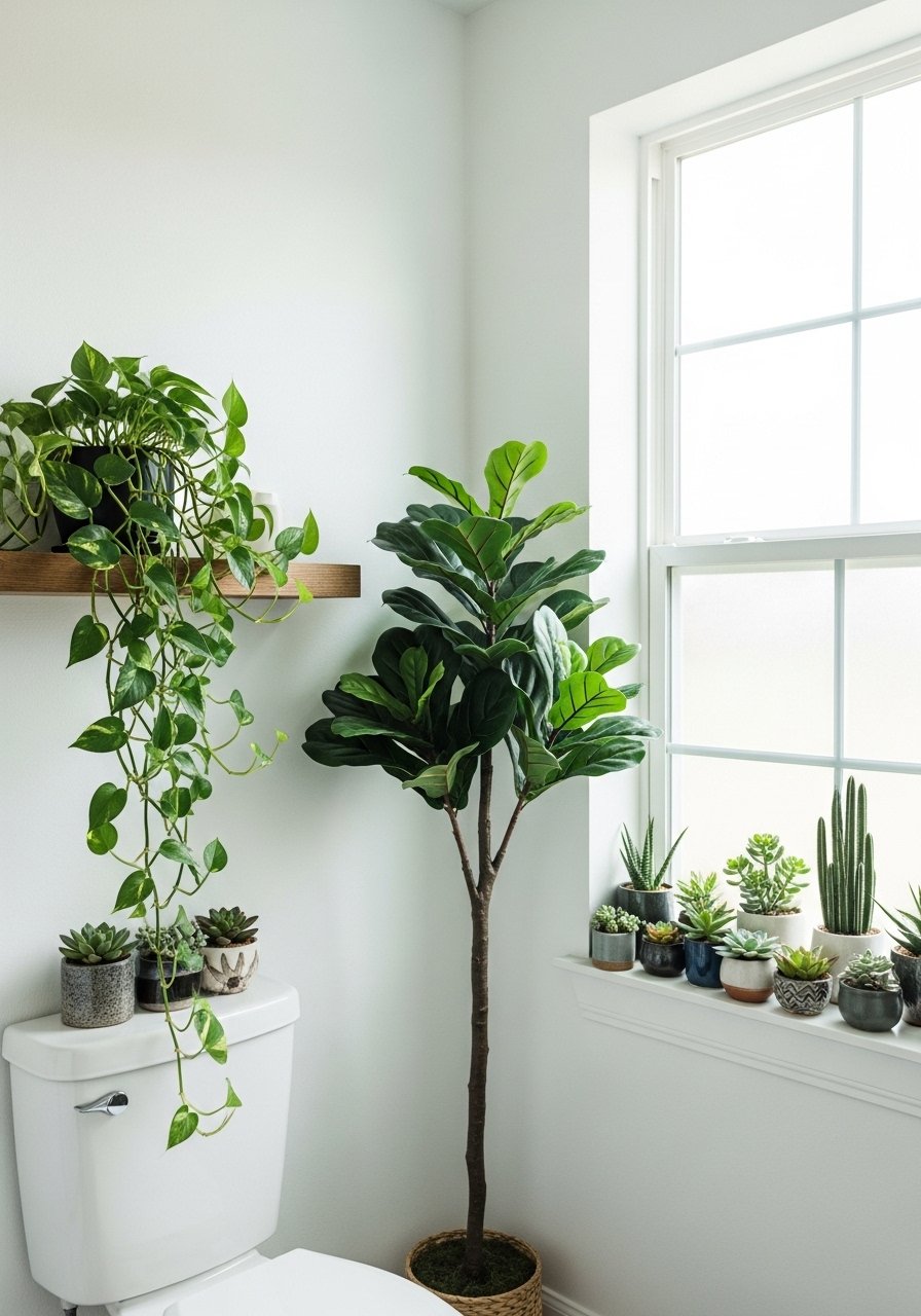 I moved plants into unexpected spots — a tall faux fiddle leaf fig in a dark corner and a trailing pothos on a high shelf — to create depth. Choose one larger plant and a few small ones for variety. I used an artificial fiddle leaf fig in low-light areas where real plants struggle. Avoid scattering tiny plants without a focal point; a deliberate placement plan looks collected.