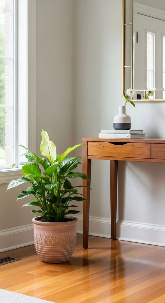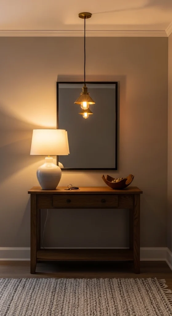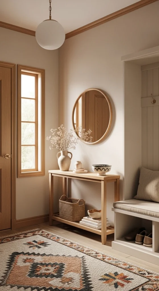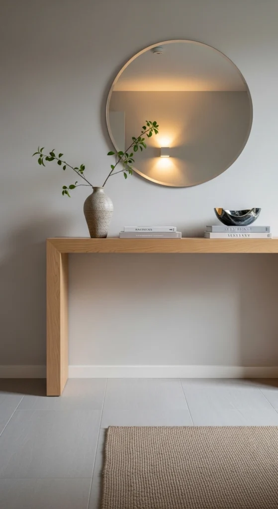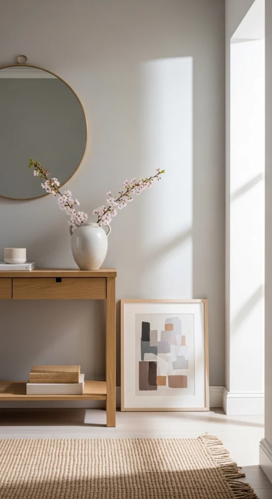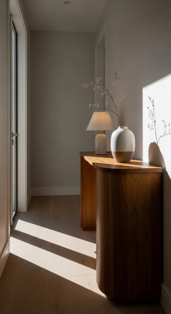 Rounded furniture lines soften first impressions. A console with curved edges feels welcoming in tight spaces. Look for secondhand pieces and lightly sand sharp corners if needed. Style the surface with one vase, one lamp, and open space in between. This keeps the look relaxed and easy to clean.