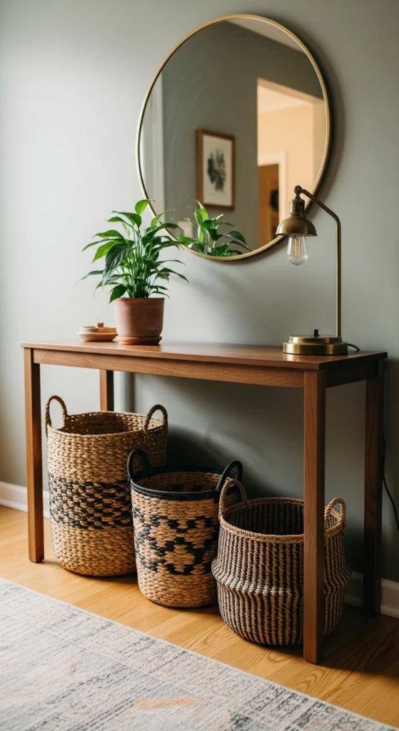 Baskets hide clutter quickly. Label the inside if needed. Choose neutral fibers for a clean look.