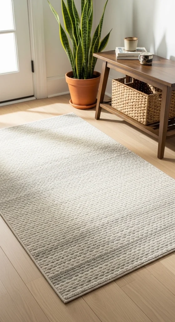 Rugs define the area. Low-pile styles are easier to clean. Choose patterns that hide dirt.