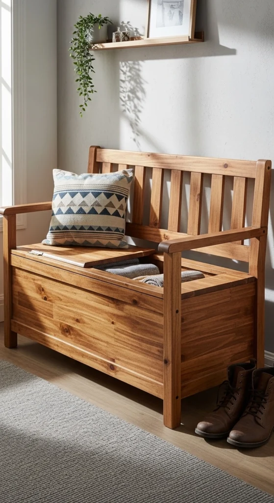 Seating makes putting on shoes easier. Storage benches hide bags and scarves. DIY versions can be made from basic wood crates and a cushion.