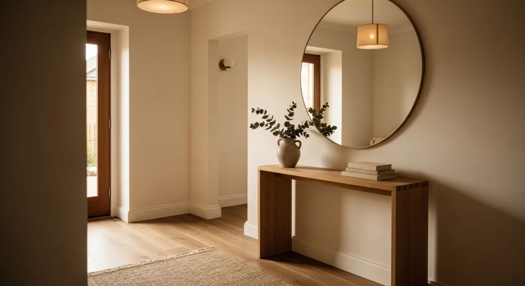 Rounded furniture lines soften first impressions. A console with curved edges feels welcoming in tight spaces. Look for secondhand pieces and lightly sand sharp corners if needed. Style the surface with one vase, one lamp, and open space in between. This keeps the look relaxed and easy to clean.