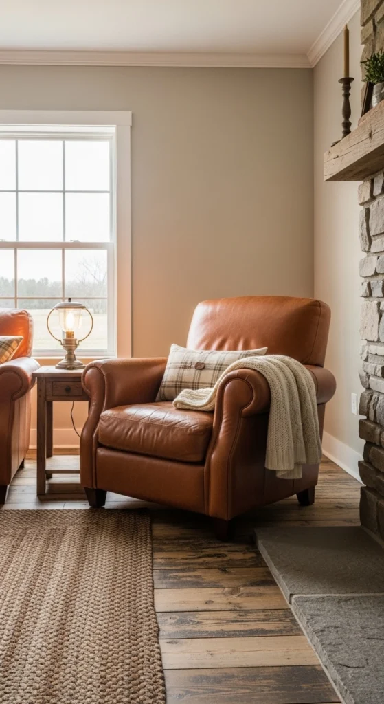 Leather adds warmth and texture. A single chair or bench works well. Check resale shops for worn-in leather. Scratches add character. Balance leather with soft throws or pillows so the space feels inviting.