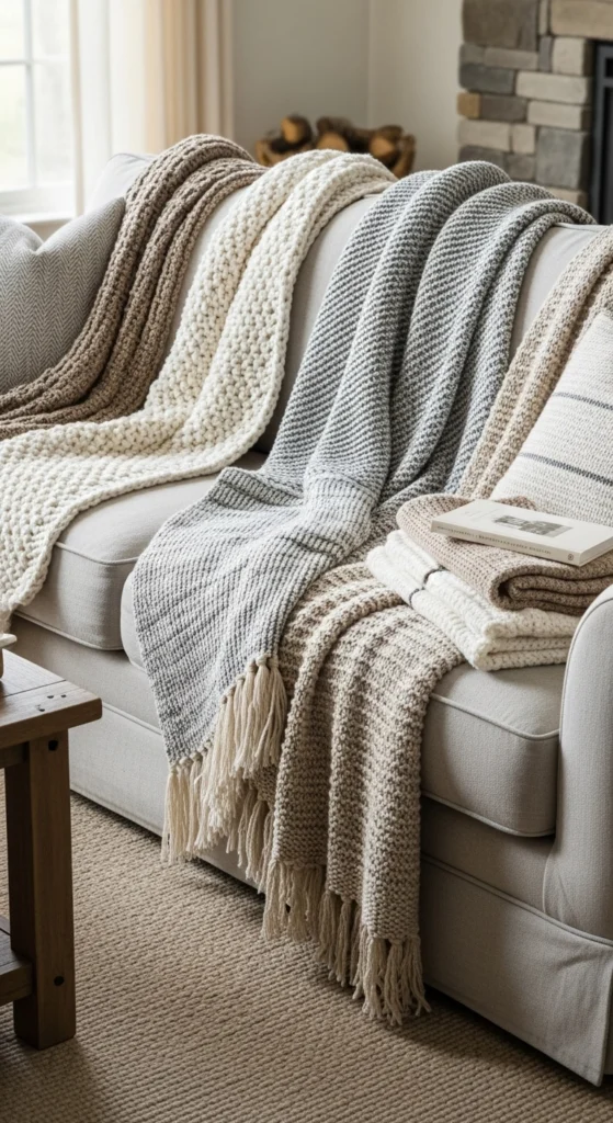 Throws add comfort fast. Drape them over chairs, benches, or beds. Mix knits with woven styles. Neutral shades work year-round. Budget tip: seasonal sales often have quality throws at low prices.