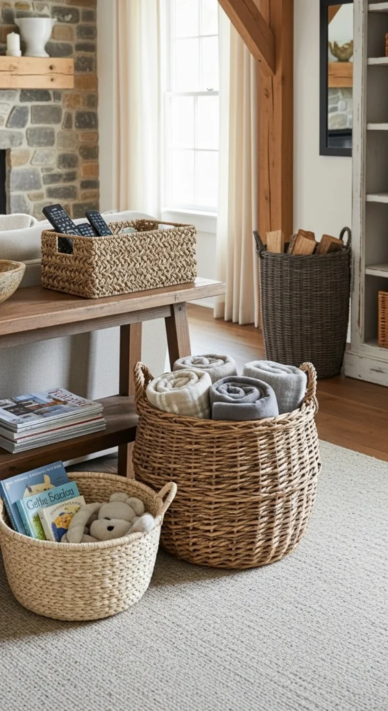 Baskets handle storage without looking messy. Use them for blankets, toys, or shoes. Stick to natural fibers like jute or seagrass. Different sizes add interest. Keep them grouped to avoid visual clutter.