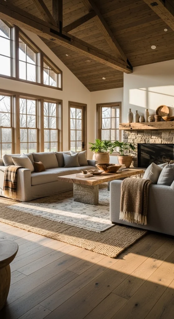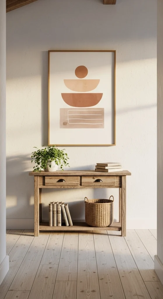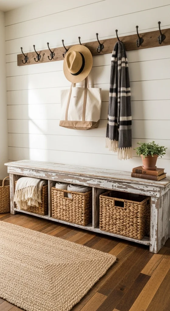 Entryways set the tone. Use a bench, hooks, and baskets. Wood pieces with wear feel welcoming. Keep surfaces mostly clear so the space stays functional.
