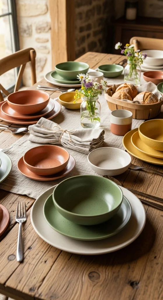 Tableware shows style daily. Choose ceramic plates in warm shades. Mixing tones looks relaxed. Open shelving makes them part of the decor. Avoid overly shiny finishes.