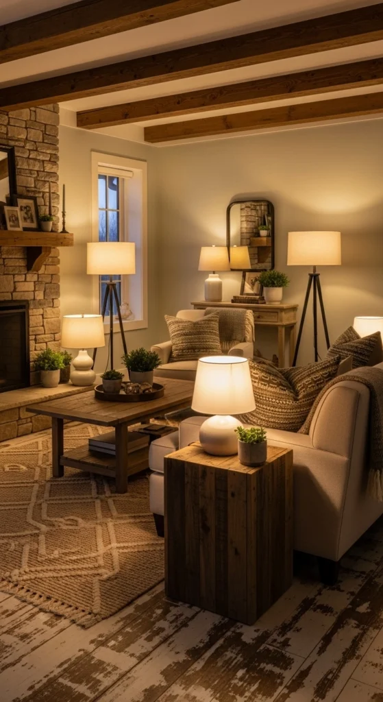 Layer lighting sources. Use table lamps, floor lamps, and wall lights instead of relying on ceiling lights alone. Warm bulbs create comfort. Lamps from thrift stores often just need new shades.