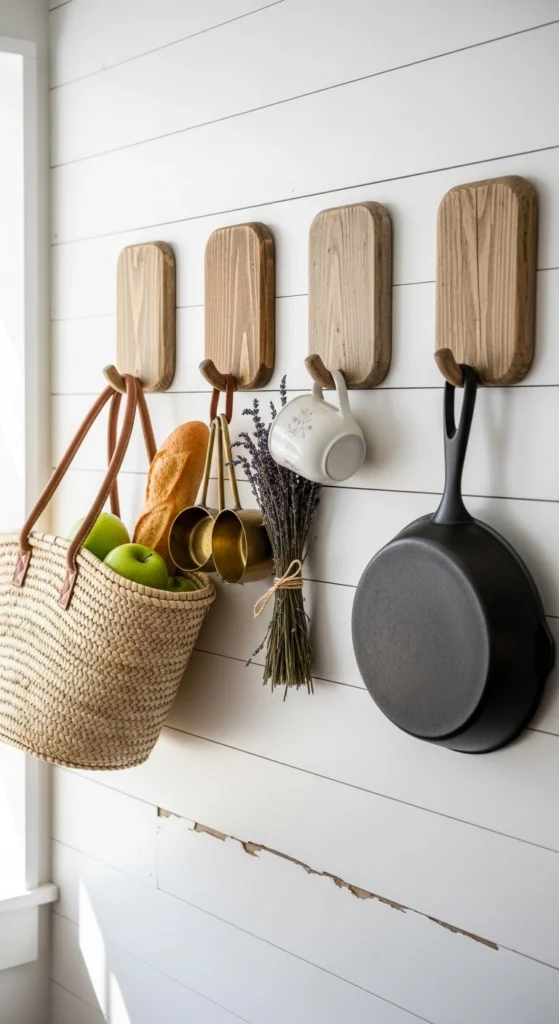 Hooks add function and style. Use handmade or simple wood designs. Hang aprons, towels, or bags. Keep spacing even for a tidy look.