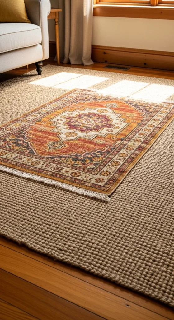 Layered rugs add depth without buying one large rug. Start with a jute or flatwoven base. Add a smaller patterned rug on top. This works well in living rooms and bedrooms. Thrifted rugs are perfect here since wear adds character. Keep colors warm and muted. Avoid busy patterns on both layers. One simple, one detailed works best.