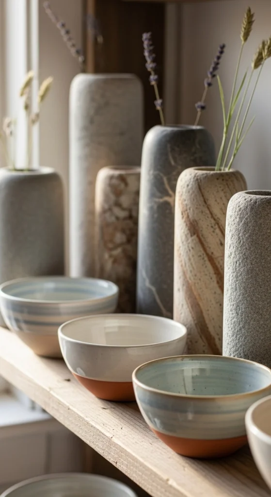 Stone and ceramic pieces ground a space. Think bowls, vases, or lamp bases. Handmade looks best, even with small imperfections. Check local markets or thrift shops. Group items in odd numbers on shelves or tables. Keep colors earthy. One stone piece per area is enough to avoid clutter.
