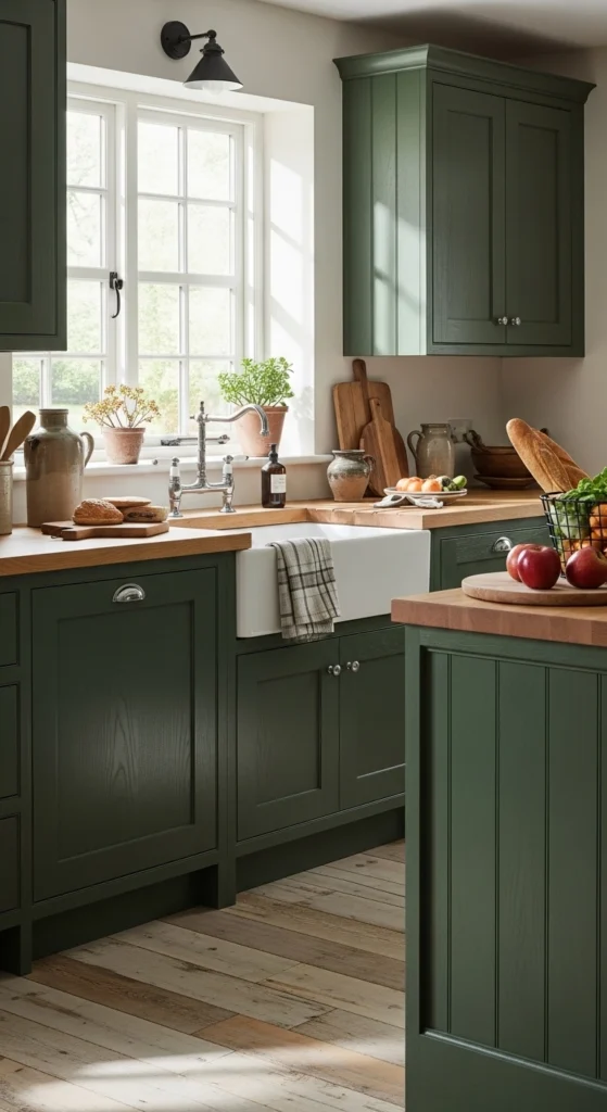 Dark cabinets feel cozy when balanced right. Deep green or navy works well with wood counters. If painting cabinets feels like too much, paint just the lower ones. Another option is swapping cabinet fronts on an island only. Use simple hardware in black or aged metal. Keep walls light to balance the depth.